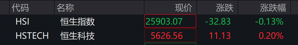 恒指低开0.4%,报25833.11点;恒生科技指数跌0.41%。腾讯控股跌1.1%,京东、网易跌超0.9%,阿里巴巴跌0.8%。