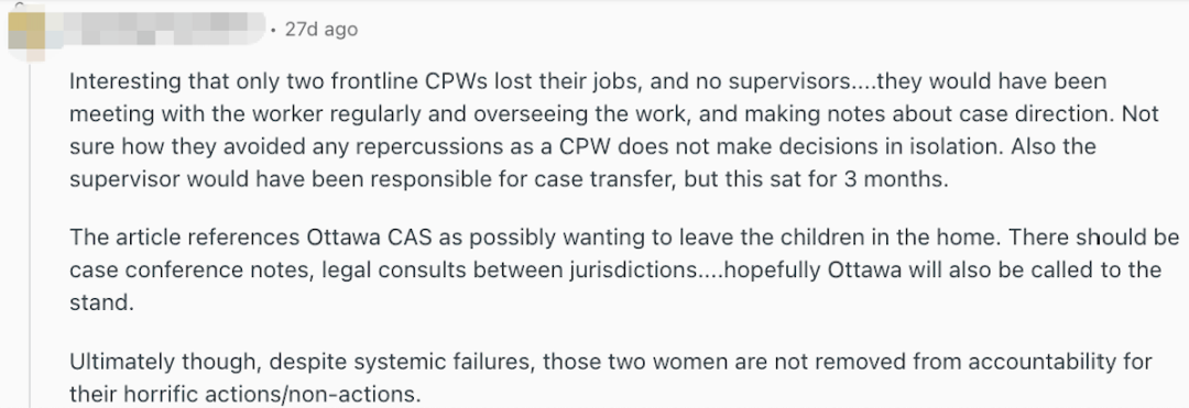 有人质疑:“有意思的是,只有两名一线儿童保护工作者丢了工作,却没有任何主管受到惩处……主管本应定期与工作人员会面、监督工作进度,并为案件方向做记录。我实在不明白他们为何能全身而退?”