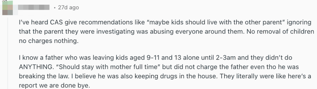 另有网友吐槽CAS监管松散:“我听说过CAS处理案件只是给出建议,比如‘或许孩子们应该和另一位家长住在一起’,却完全无视他们正在调查的那位家长一直在虐待身边所有人的事实。既不带走孩子,也不提出指控,什么都不做。”