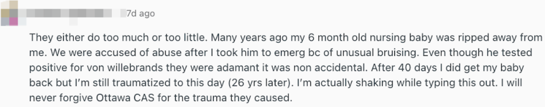 曾遭CAS不公对待的网友回忆:“CAS要么管得太多,要么管得太少。很多年前,我6个月大还在吃奶的宝宝被他们强行带走了。当时我因为宝宝身上出现异常瘀伤带他去急诊,结果我们被指控虐待。即便后来检测出宝宝患有血管性血友病(导致瘀伤的原因),他们仍然坚称这是人为伤害。40天后,我终于把宝宝接回来了,但直到今天(26年后),我仍然受着创伤的困扰。”