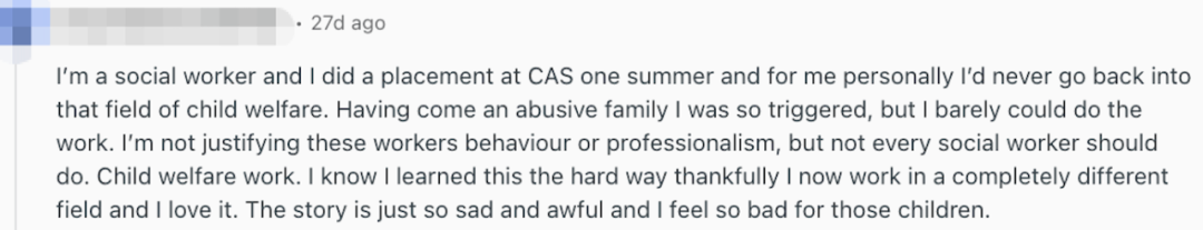 曾经在CAS工作过的网友透露:“就我个人而言,我再也不会回到CAS工作了。我自己就来自一个受虐待的家庭,这份工作让我频繁触发创伤,几乎无法开展工作。我并不是在为这些工作人员的行为或职业素养找借口,但确实不是每个社工都适合做儿童福利工作。”
