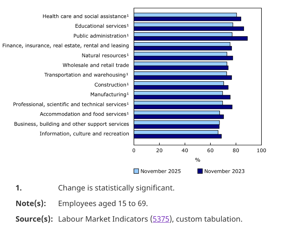 幸运的是,加拿大统计局会定期更新工人情绪数据,并将补充报告纳入最新统计结果。数据显示,11 月仅有 73.6% 的员工感到就业安全,即不担心未来 6 个月内失业。