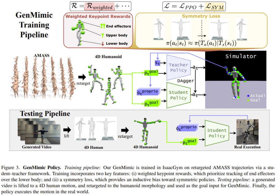 为了解决从生成视频中执行人形机器人动作的挑战,该团队提出了一个基于 4D 重建的两阶段流程,并提出了一个新的 GenMimic 跟踪策略。图 3 展示了方法概况。