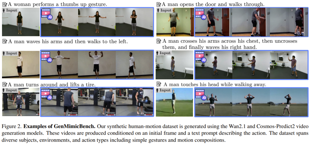 利用 Wan2.1 和 Cosmos-Predict2 整理了合成人类动作数据集 GenMimicBench,建立了评估零样本泛化和策略鲁棒性的可扩展基准。