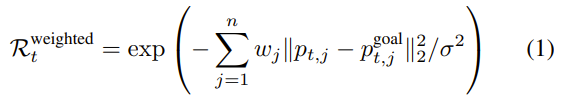 某些关键点(例如对应于末端执行器的关键点)在任务执行和物理稳定性方面本质上比躯干或非接触关键点更为关键。因此,该团队将跟踪奖励设计为使用逐关键点误差的加权组合: