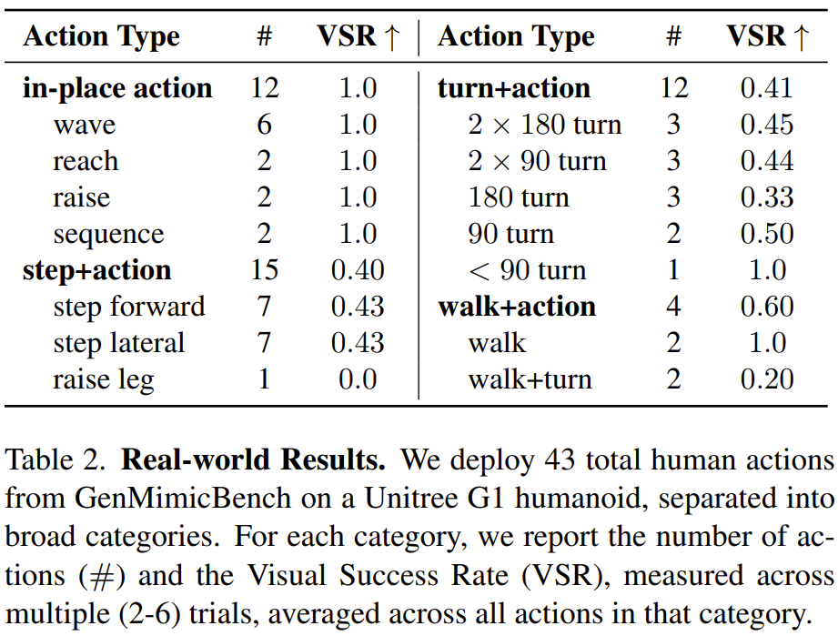该团队总共推演了 43 个动作,并在表 2 中报告了视觉成功率 (VSR)。与仅衡量偏离基准真值的定量仿真指标不同,VSR 评估执行的动作在视觉上是否与生成视频相似。该团队将任何过度的跌跌撞撞或无法在视觉上跟随关键关键点(如手或脚)的情况视为失败。