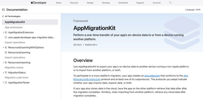 但今年 10 月份,苹果在自家开发者页面上悄悄整了个名叫 “ AppMigrationKit ( 应用迁移套件 )” 的新框架文档,也许就是冲着解决换机这件事去的。