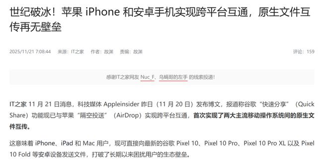 先说一个对咱们消费者有好处的事儿,以后苹果和安卓设备相互换机,数据也许可以互通了。