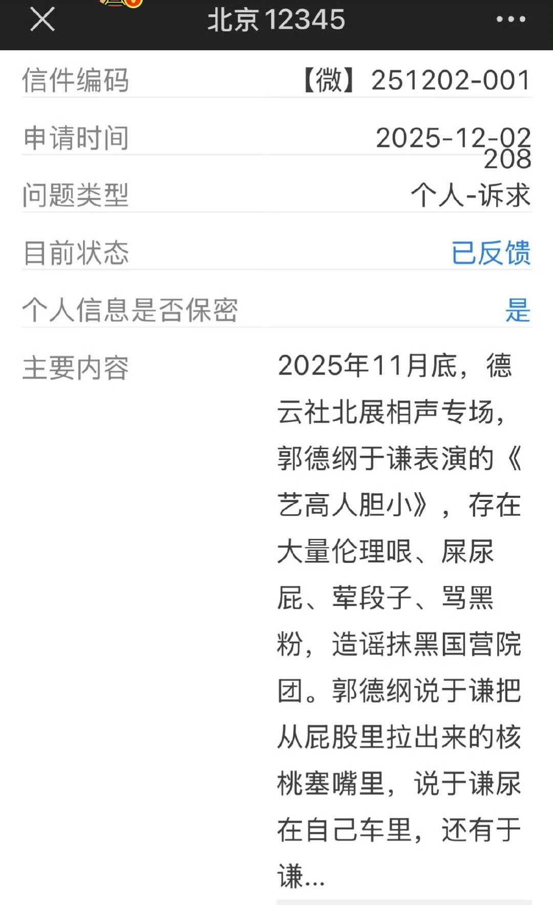 针对德云社的举报,是12月2日提交的,官方那个12月4日给予的回应。官方回馈后,相关截图就被晒出了。12月6日,在网络形成了关注。