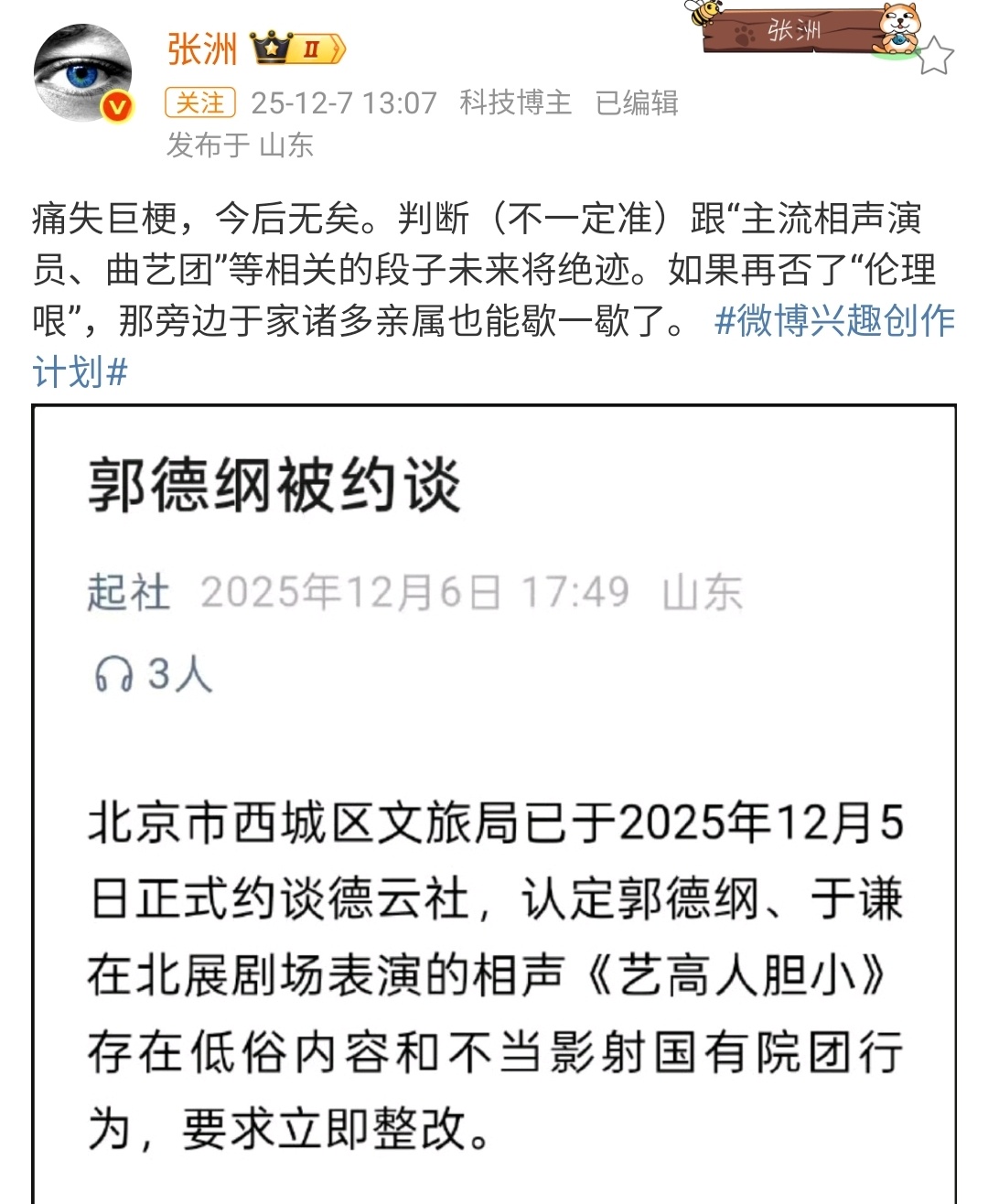 文旅局要求德云社立即整改,重新编排演出台本,不得再使用易产生负面舆论的台词。