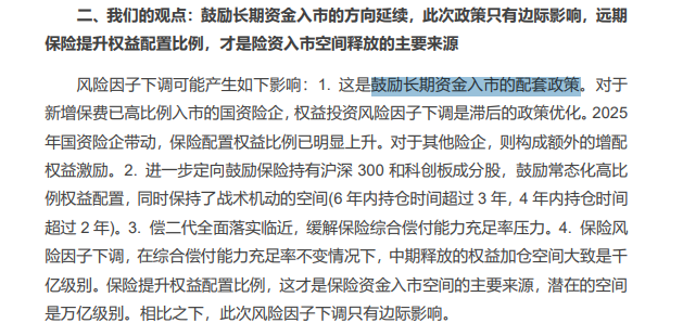 首先,这是“鼓励长期资金入市的配套政策”。对于2025年已在高比例配置权益的国资险企,此举是“滞后的政策优化”;而对于其他险企,则构成增配权益的额外激励。