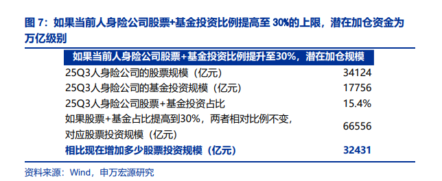 数据显示,截至2025年三季度末,保险公司投资股票和基金的占比超过15%,距离监管允许的30%上限仍有较大距离。据申万宏源静态测算,如果当前人身险公司将股票和基金的投资比例提高至30%的上限,假设偿付能力充足率等条件满足,“还可以增加32431亿元的股票投资”。