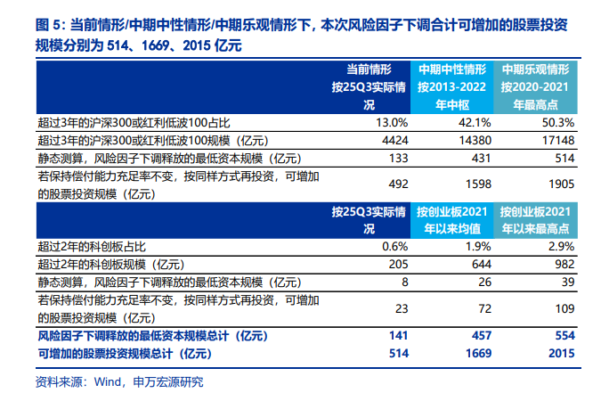 申万宏源对此进行了量化测算。报告构建了当前、中期中性、中期乐观三种情景假设。在中期中性情景下(即假设长期持仓占比回归至历史均值水平),本次风险因子调整释放的最低资本规模约为457亿元。报告指出,“如果保持偿付能力充足率不变,释放最低资本用于同样方式投资”,可增加的股票投资规模约为1669亿元。在乐观情形下,这一数字可达2015亿元。