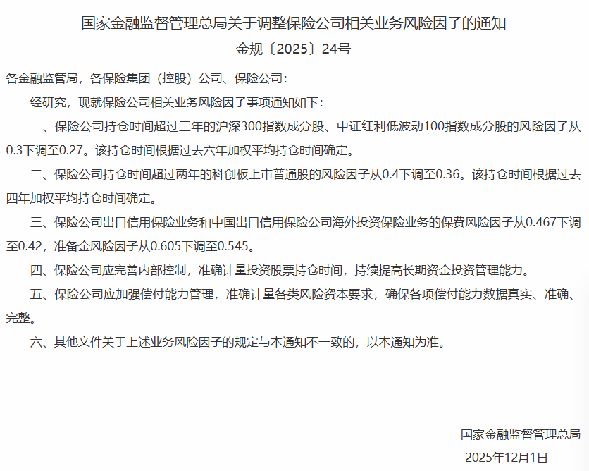 这一政策动态来自国家金融监督管理总局于2025年12月5日发布的《关于调整保险公司相关业务风险因子的通知》。根据通知,保险公司持有特定A股标的并满足一定持仓期限后,其在计算偿付能力充足率时适用的风险因子将获得下调。