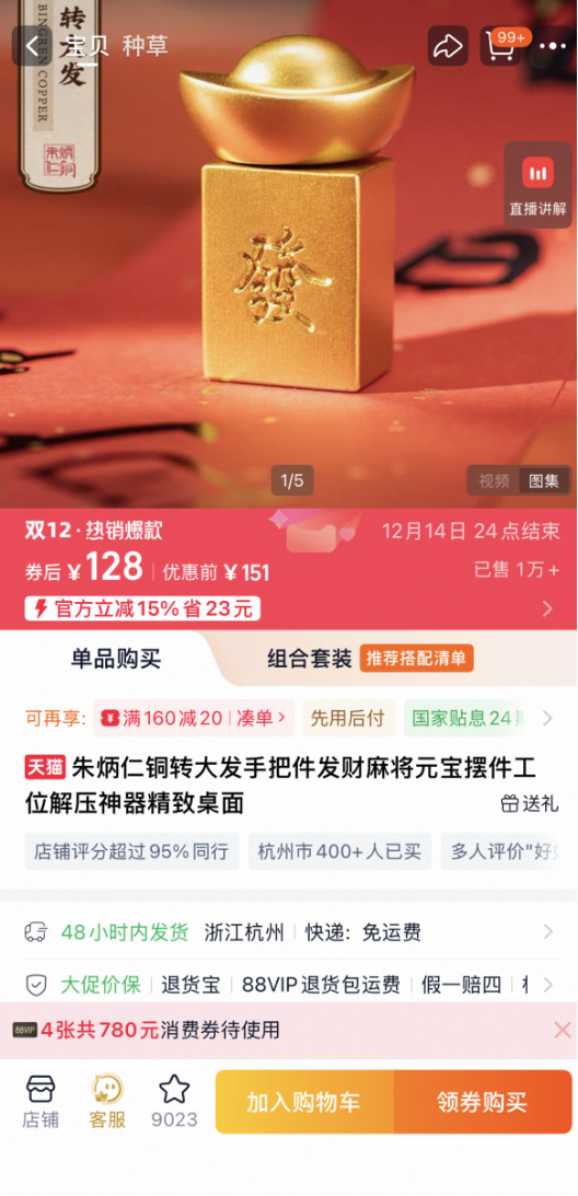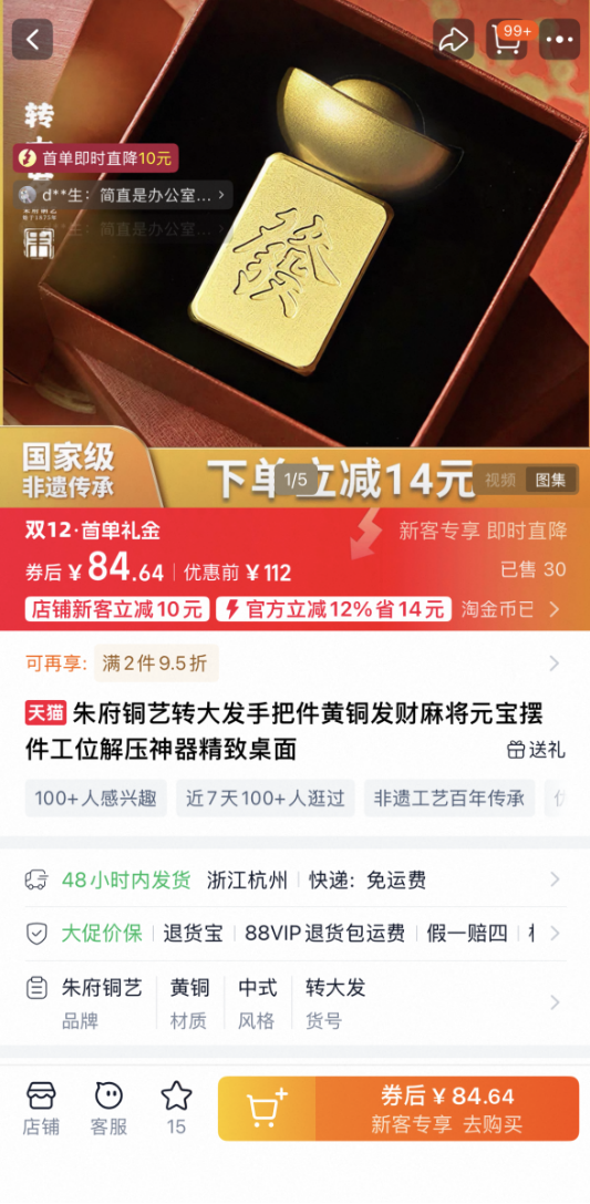 在淘宝平台上,朱炳仁铜推出的“朱炳仁铜转大发手把件发财麻将元宝摆件工位解压神器精致桌面”与“朱府铜艺转大发手把件黄铜发财麻将元宝摆件工位解压神器精致桌面”名字相似,设计均是“发财方块+元宝”。