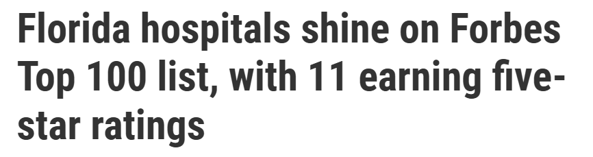 佛州医院在患者治疗效果方面成绩亮眼,共有12家医院获得五星评级,包括AdventHealth Daytona Beach、迈尔斯堡的Lee Memorial Hospital及杰克逊维尔的梅奥诊所。