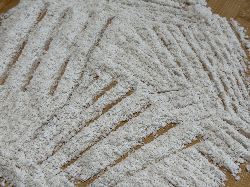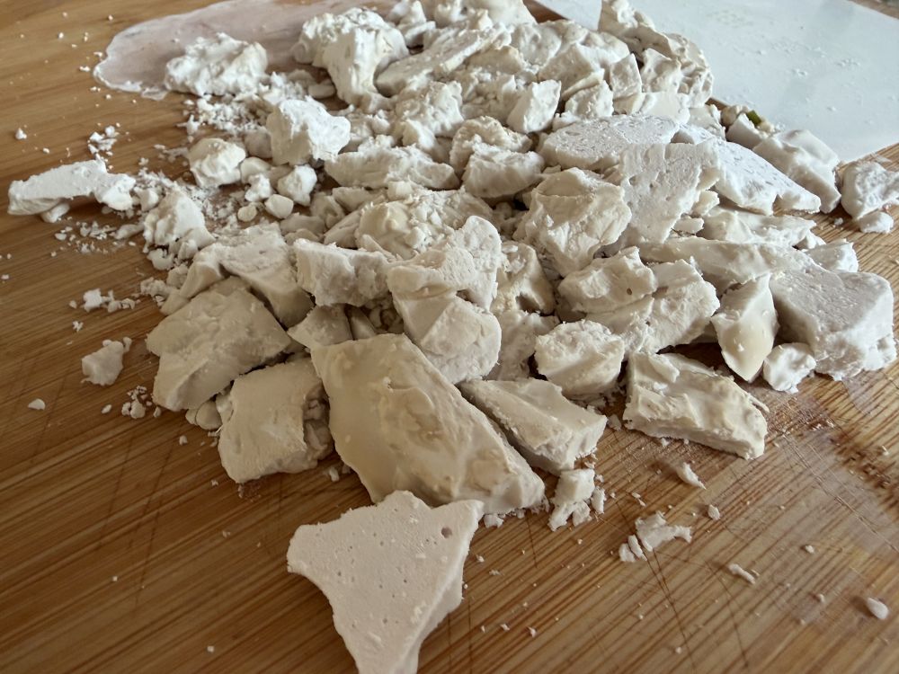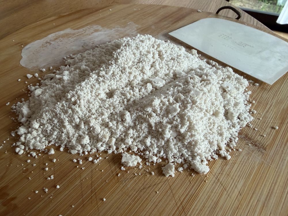 第一批晾晒的地瓜粉。加工地瓜粉的工程,不大也不小啊。首先去地瓜皮,用清水洗净,切块加水放入破壁机打30秒,倒入滤袋攥干,再把渣再次放入破壁机加水打30秒,再次倒入滤袋攥干。沉淀后倒掉上面的水,就是下面的湿地瓜粉了。