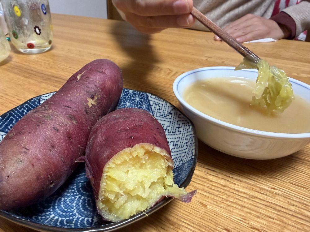 之前说到收获了很多的地瓜,后来领导又拿回来很多的小小的,我就把一部分做了地瓜粉。发现用地瓜粉代替土豆粉,炸出的东西很好吃。每次蒸地瓜都是太费时间了,原因是蒸屉里水太远,散热快导致里面不容易熟不说,蒸出的地瓜太干,也是我不喜欢的。今天早上换了一个深锅,家里没有那种带支架的小廉子,就把一个漏网倒扣过来,再把地瓜放上去,这样地瓜就会整体都在深锅里面,上面盖上玻璃不透气的盖子,就是类似于高压锅的原理吧。蒸好的地瓜软软的和淌糖浆的烤地瓜一样好吃。正好下面的水干了(煮的时候水不要全部没过地瓜,那样就不甜了,水位刚好到地瓜的部分最理想),挂在锅底的全是糖。我尝了尝好甜啊。干吃地瓜容易烧心,所以就地取材做了一碗酱汤。用了白菜鬼子姜,都是自己地里的东西。冬季喝上一碗,真是又暖胃又舒服呢。