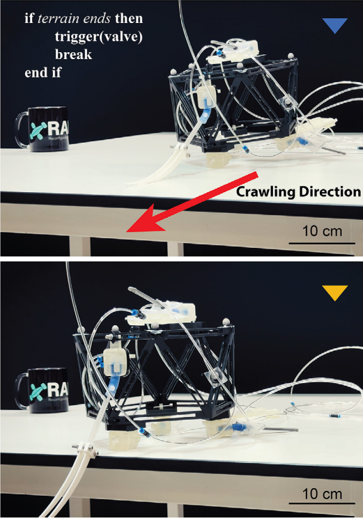 这款机器人更实用:集成了一个传感器、一个阀门和两个执行器。传感器被机器人自身重量压在桌面上,当它爬到桌面边缘时,传感器失去支撑,触发阀门切断气流,执行器停止运动,成功避免坠落。