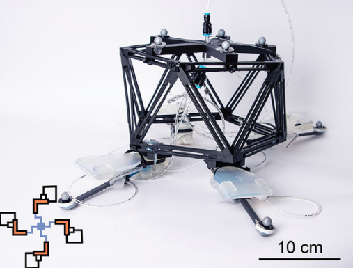 这款机器人的底座有五个流体单元作为“腿”,接通气压后,起初 limbs 动作杂乱无章,但很快就通过机械耦合(肢体运动通过机身和地面相互影响)自发同步,交替跳跃,最高能跳70mm,每秒约6次跳跃。