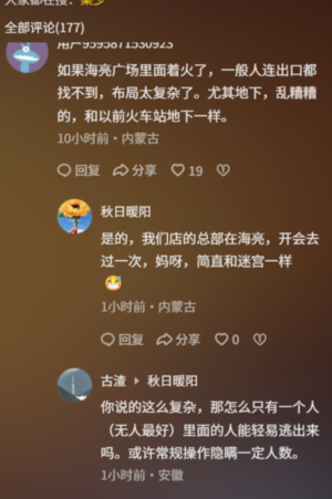 根据当地知情网友透露,“如果海亮广场里面着火了,一般人连出口都找不到,布局太复杂了。尤其地下,乱糟糟的,和以前火车站地下一样。”