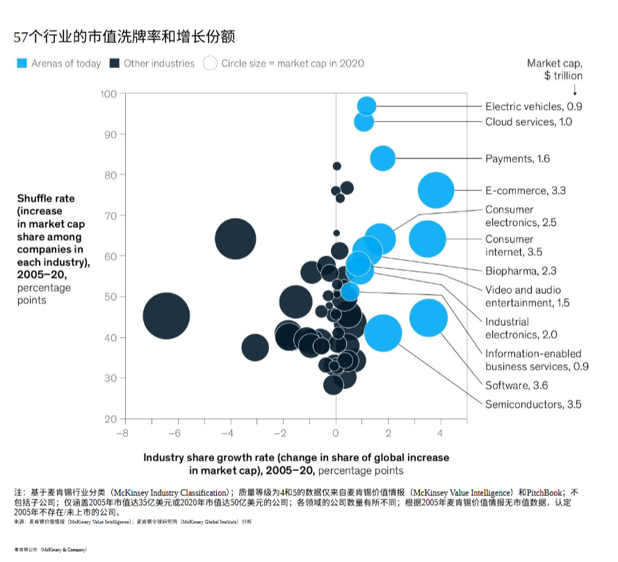 在这些行业里,“洗牌率”,也就是各家公司,在业内增加的份额之和,收入方面达到了49%,其他行业为32%。市值方面,洗牌率为66%,而其他行业为47%。这,是高活力。