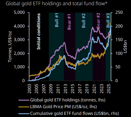 除了短期交易逻辑,资金流向数据也显示黄金的上涨空间尚未被填满。分析引用Gold.org的数据显示,尽管黄金处于这一轮牛市之中,但目前的投资流入量仍然低于之前几个周期的水平。这表明市场资金尚未过度拥挤,仍有后续资金进场的潜力。