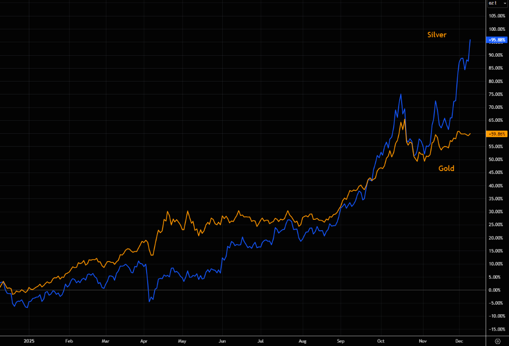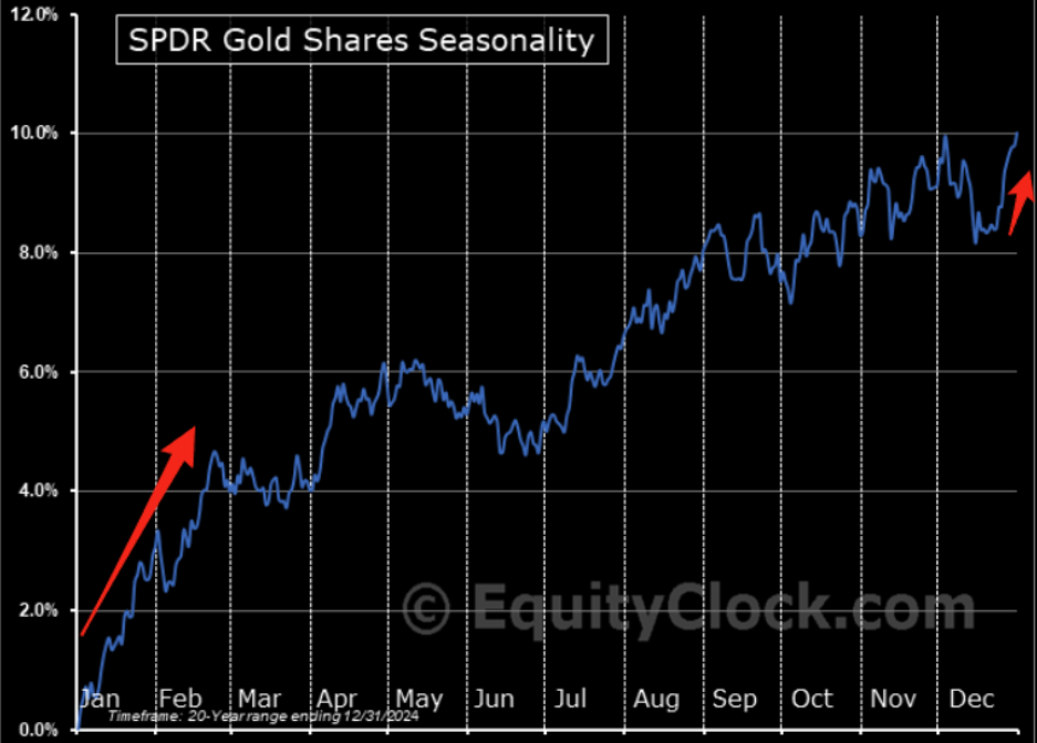 时间窗口也站在黄金多头一边。历史数据显示,黄金通常会在年底出现逼空式上涨,并且这种动能往往会延续至次年的一月和二月。