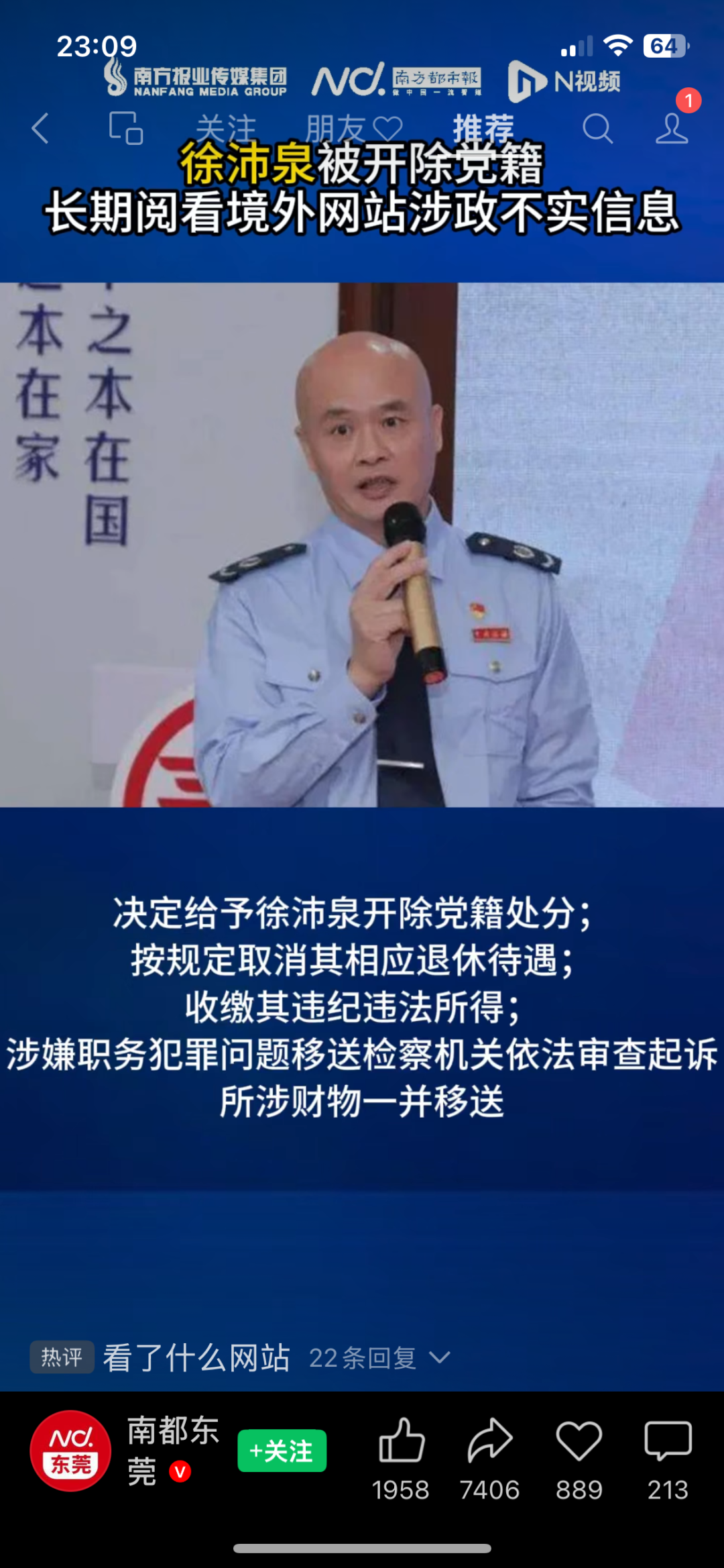 南方都市报网站客户端在视频中,出示徐沛泉此前出席活动的画面。画面中,他身穿蓝色制服、手持话筒。视频上方字幕写着“长期阅看境外网站涉政不实信息”,下方字幕标示纪律处分内容。