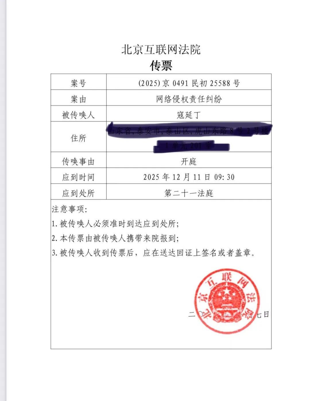 百度AI制造谣言名誉侵权,事实清楚,证据确凿,北京市互联网法院很快立案受理,并发来盖着法院大红印章的开庭传票,而且明文要求要在送达回证上签名盖章,这是有法律效力的。这样的传票,法院还有另一张发给了被告百度,同样会要求它在回证上签名盖章。