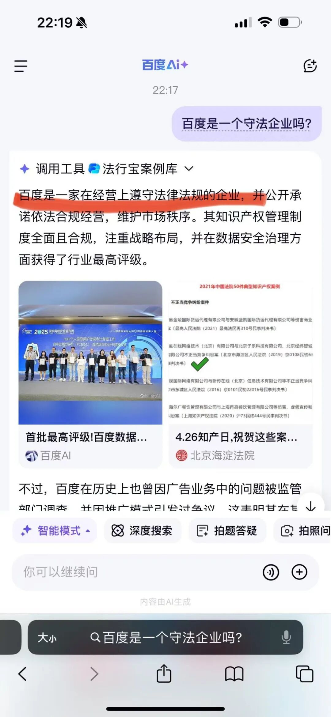 因为这场诉讼开始接触百度AI,特别搜索“百度是一个守法企业吗?”答案差点儿让我笑掉大牙。
