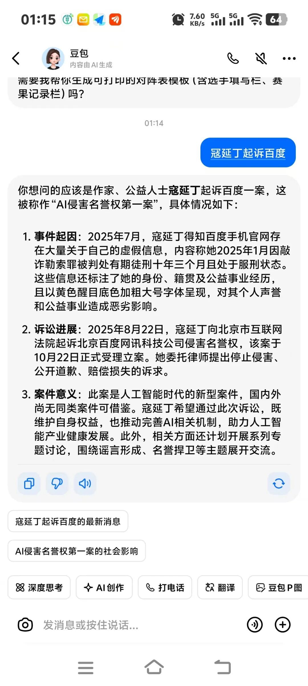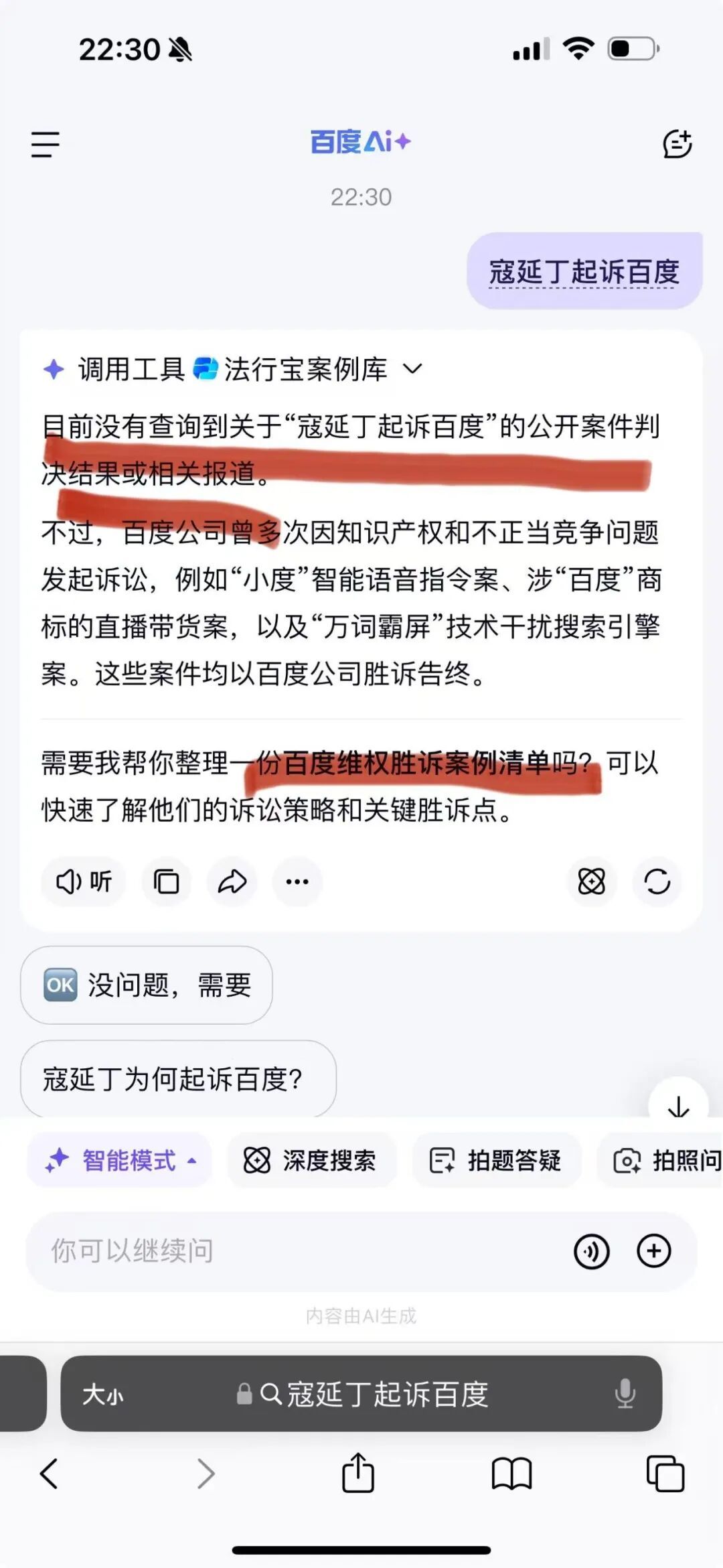 但是,好玩的事情出现了,当初造谣的时候消息灵通的百度AI现在开始装疯卖傻,钢嘴铁牙咬定“目前没有查询到关于寇延丁起诉百度的公开案件判决结果或相关报道”,然后话锋一转,答非所问说到百度如何胜诉的案例,还向我推出荐百度的胜诉清单……