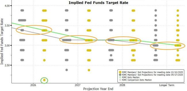 鲍威尔最终选择“鹰派降息”,一边释放宽松信号,一边暗示未来将更谨慎评估经济数据,不轻易再次行动。点阵图中暗示,2026年前最多再降息两次,即便如此,川普仍炮轰不够,声称“应该翻倍降息”,甚至透露已物色好下一任美联储主席。