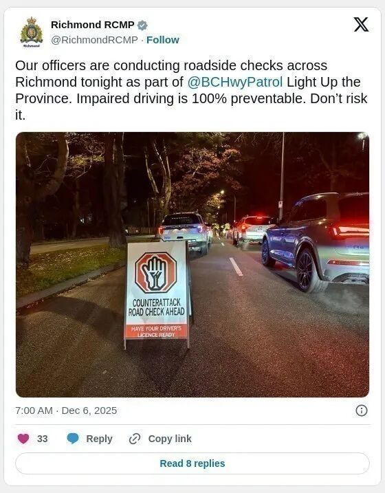 列治文皇家骑警分享了12月6日他们进行路边检查,抓酒驾司机的场景。警方表示:“酒后驾驶是完全可以预防的。不要冒险”。