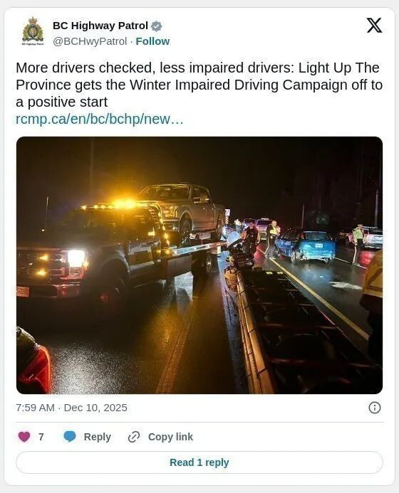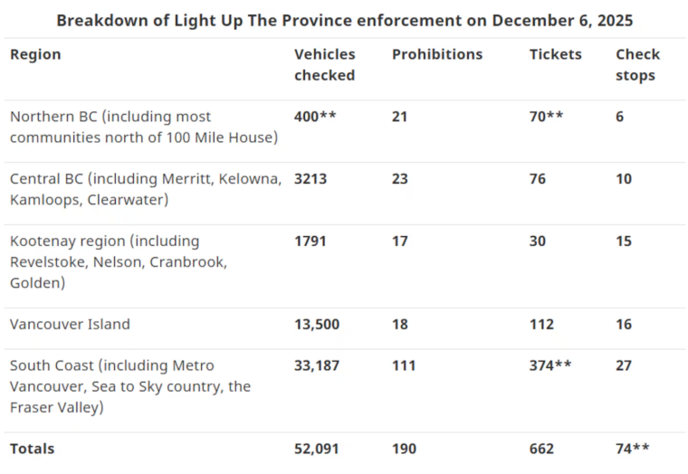 BC省斑速巡逻队(B.C. Highway Patrol,BCHP)今天公布了2025年12月6日该行动的执行结果。在那天夜里执法人员检查了 52,091 辆车,开出了 190 张路边立即禁止驾驶罚单和 662 张罚单。