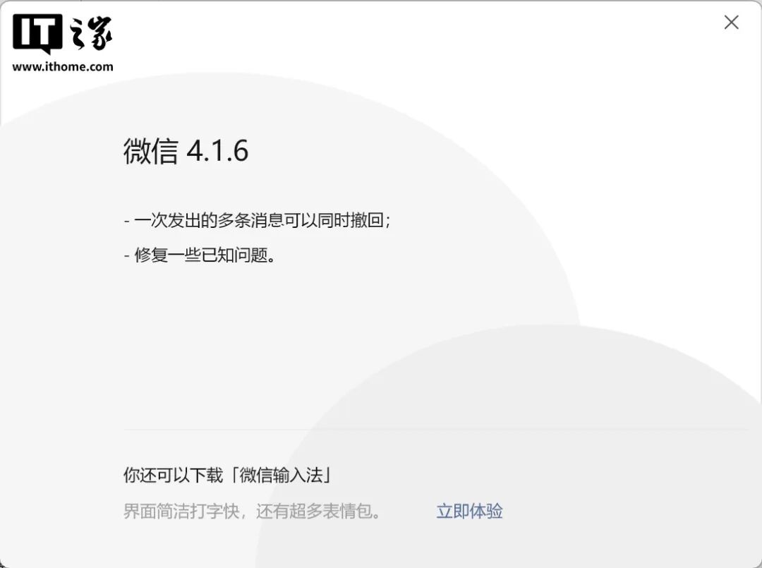 说起本次微信 PC 4.1.6 最重要的更新,莫过于增加了“一次发出的多条消息可以同时撤回”,是唯一在“更新日志”中展示的新功能。