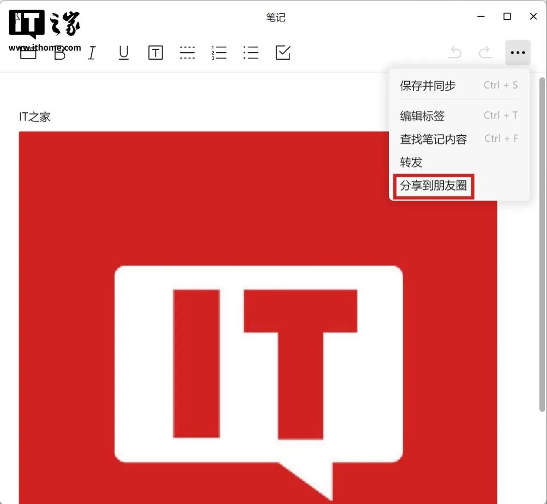 操作很简单,在收藏中点开任一笔记的编辑界面,点击右上角的“…”方能看到“朋友圈”选项。