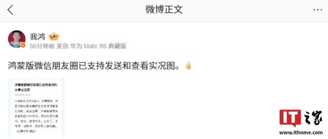 根据博主 @我鸿 分享,鸿蒙版微信朋友圈已支持发送和查看实况图。