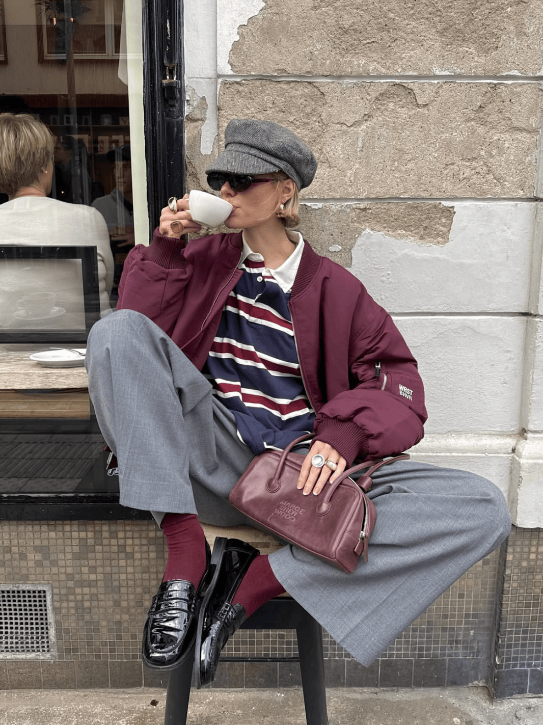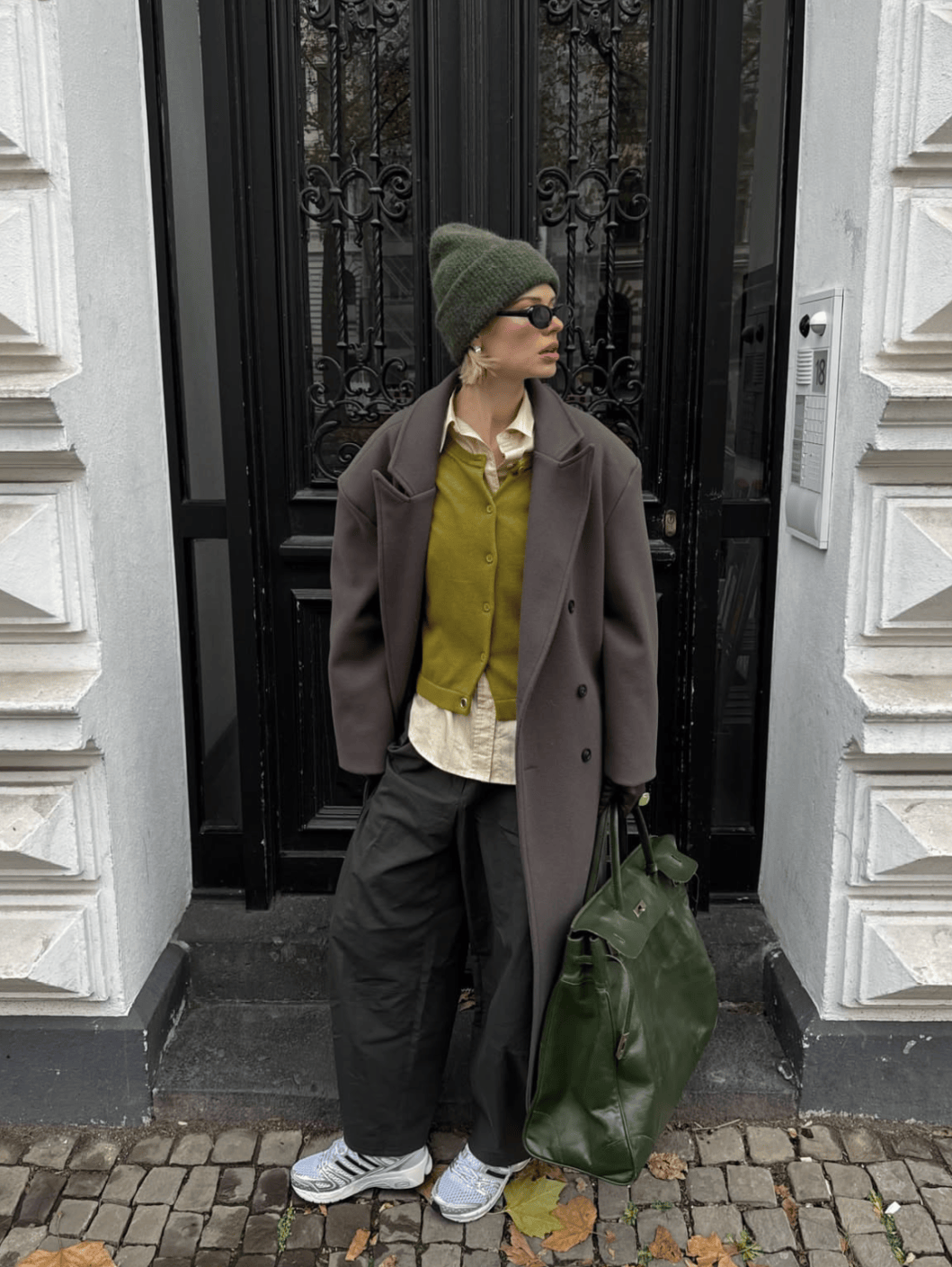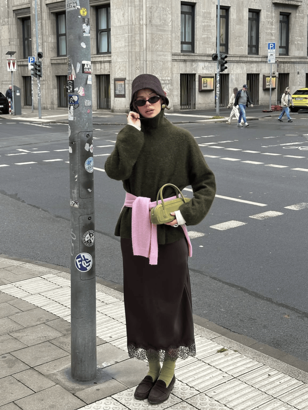 例如,一件芥末绿色的毛衣,她会用墨绿色的帽子包包让彩色的出现更自然;又或是用一双芥末绿的袜子在脚踝处巧妙呼应。