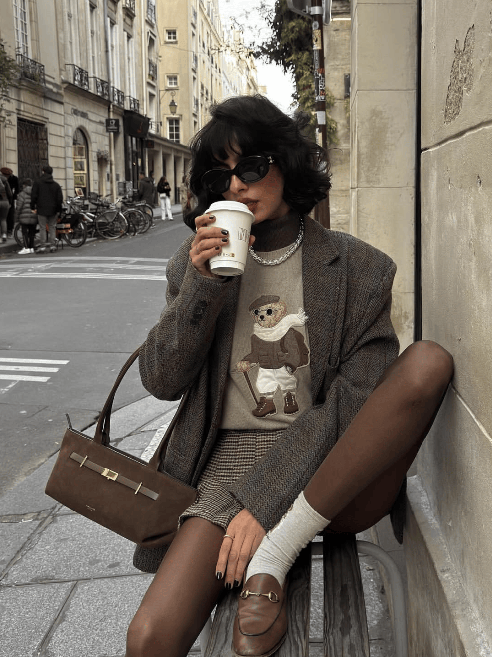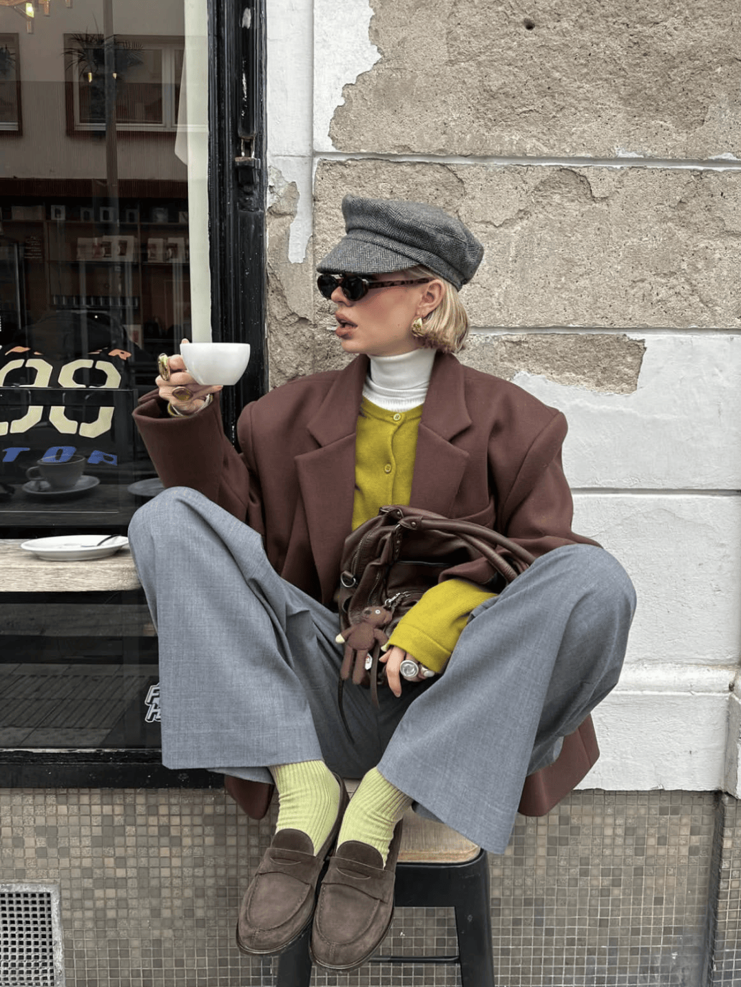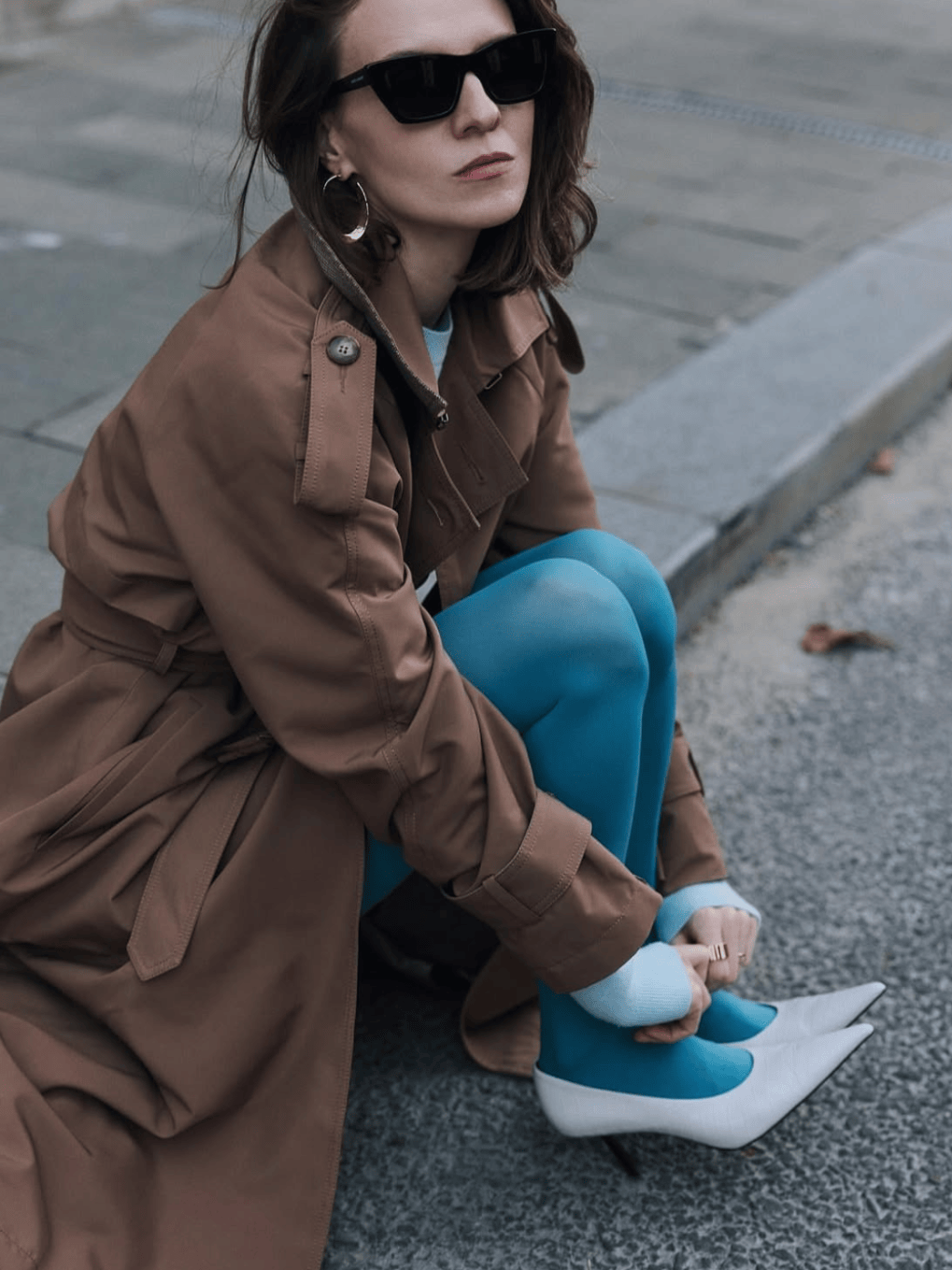 又或者是配饰,一身棕色look,则靠一双动人心魄的蓝色针织衫和蓝色裤袜,让人对蓝配棕再次心动。
