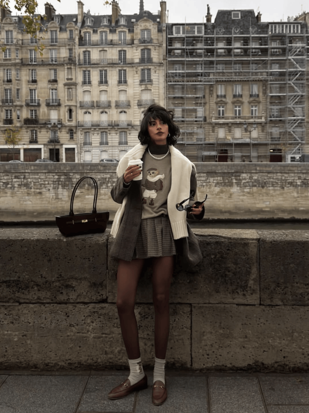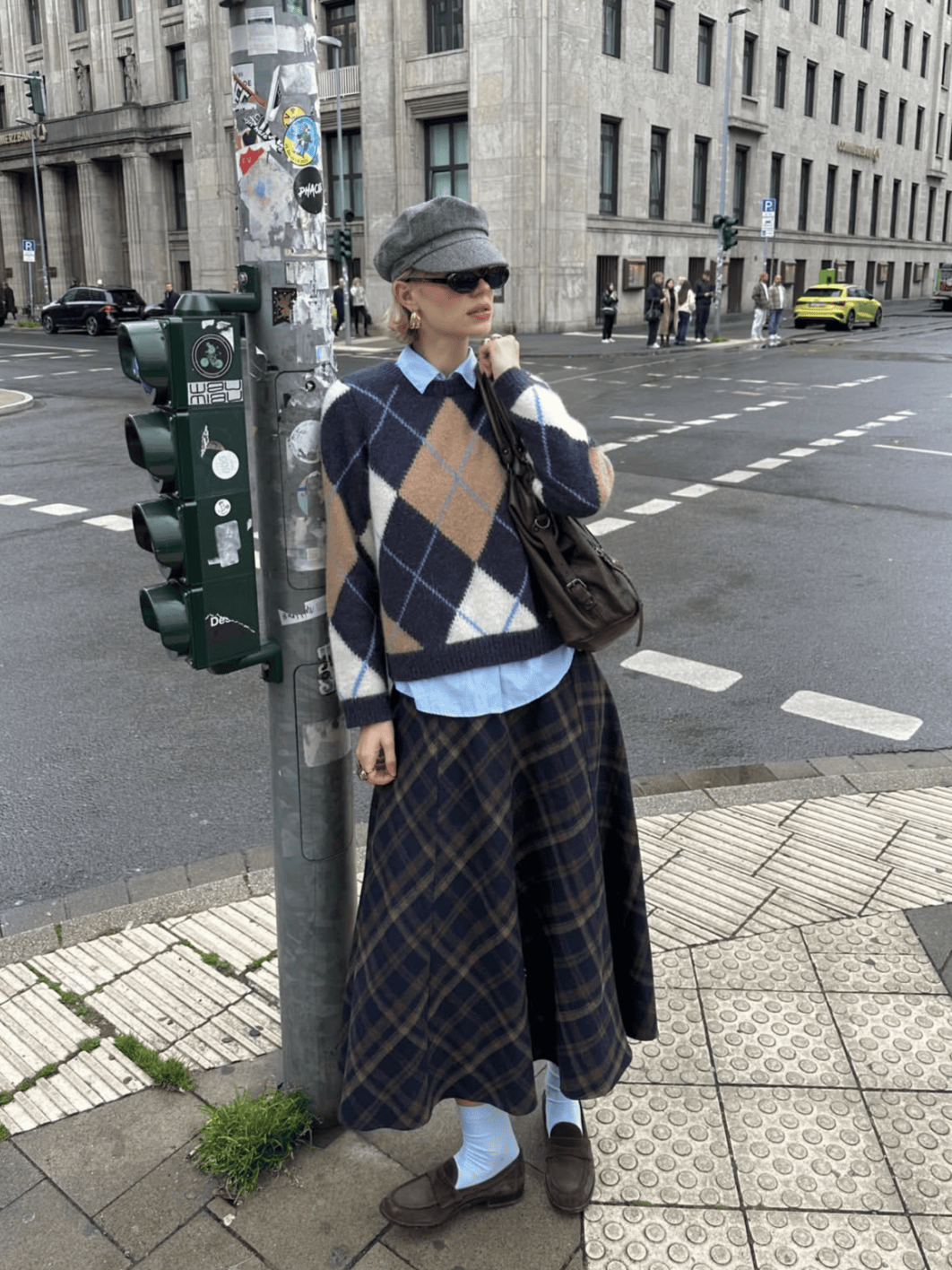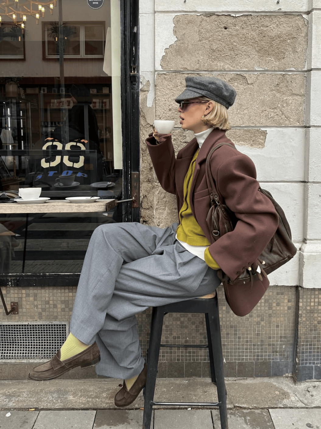 又或者是配饰,一身棕色look,则靠一双动人心魄的蓝色针织衫和蓝色裤袜,让人对蓝配棕再次心动。