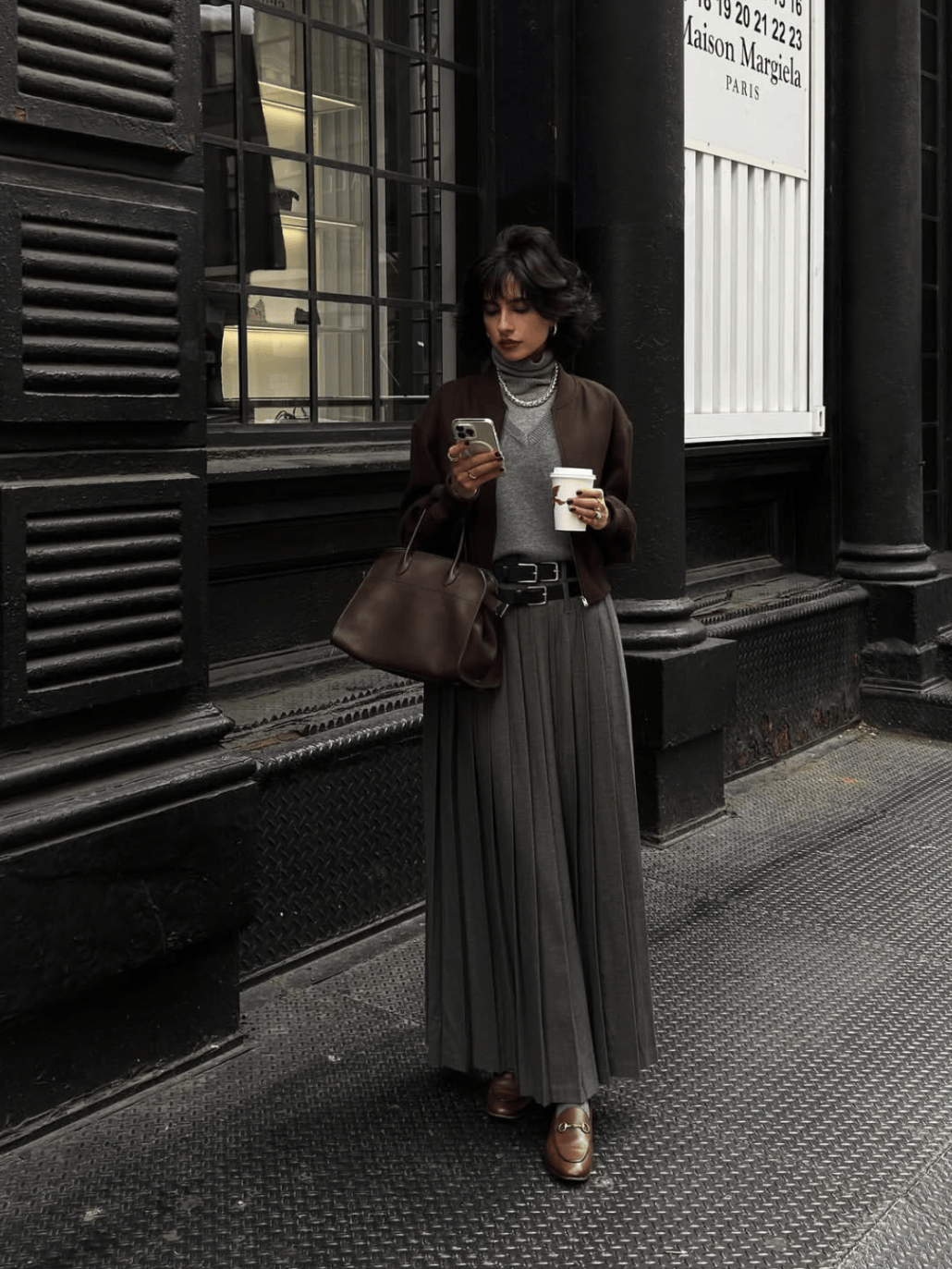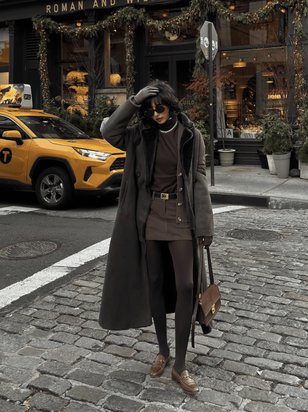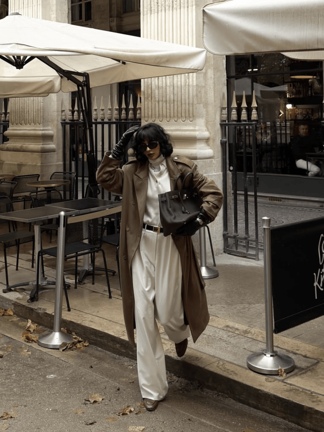 一件剪裁完美的廓形大衣,她不会简单地搭配毛衣长裤,而是内搭一套羊毛衫套装,再以一双质感细腻的黑色丝袜与乐福鞋收尾,在力量感中注入一抹危险的性感。