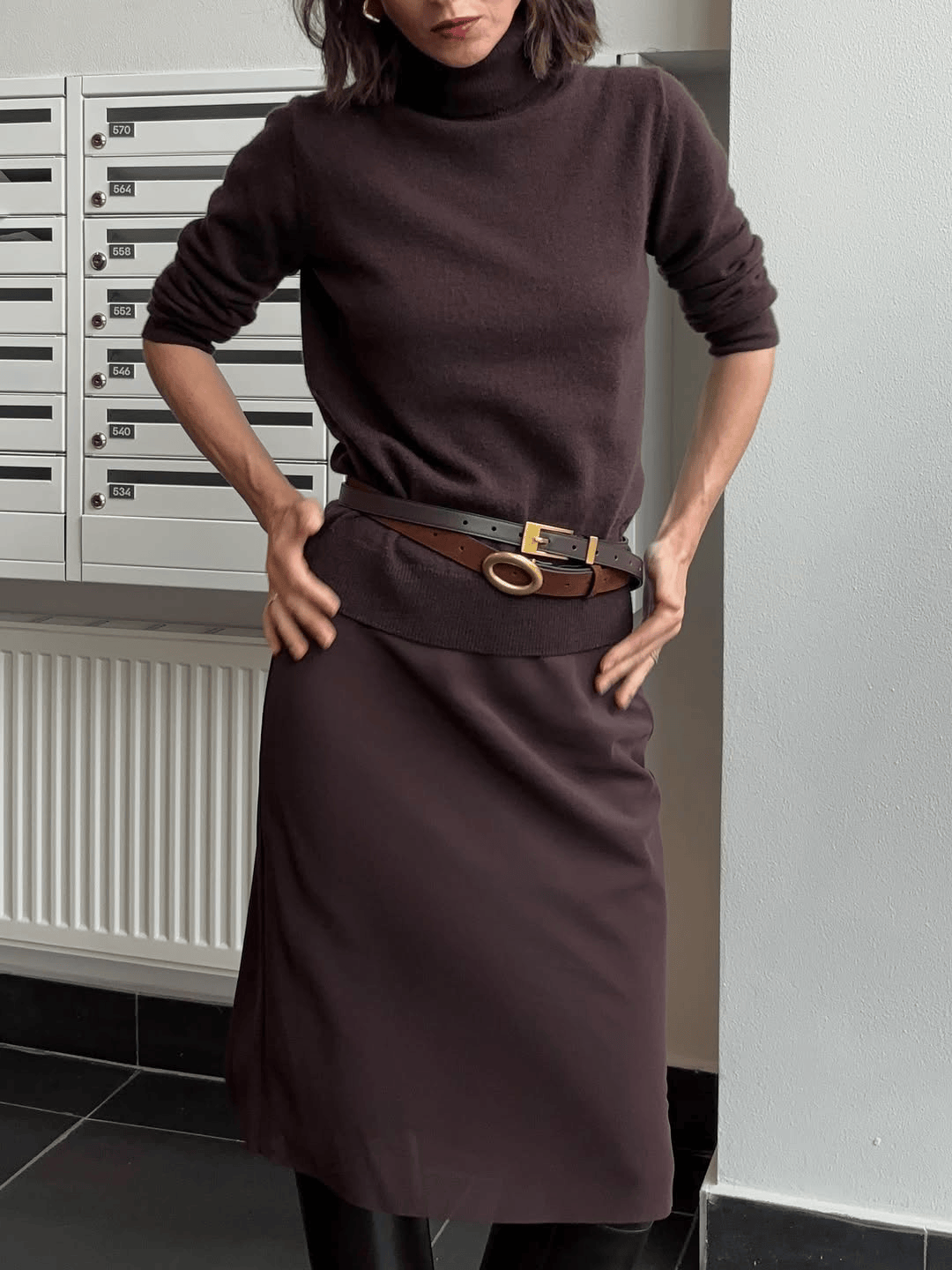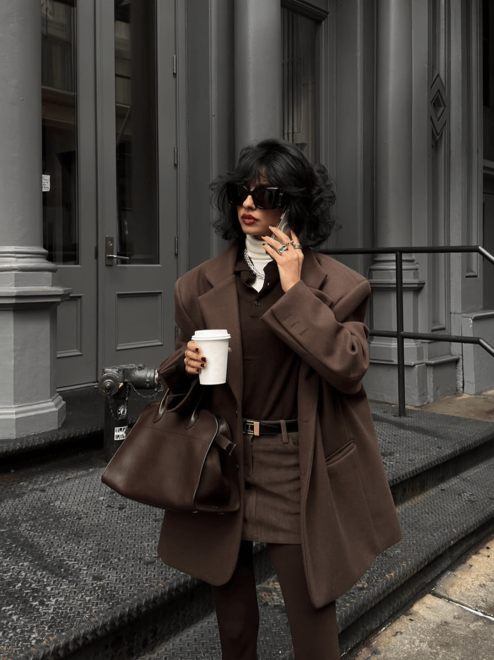 一身棕色的搭配,用同色系的柔软围巾围裹着上半身,增加流动又柔和的曲线美。