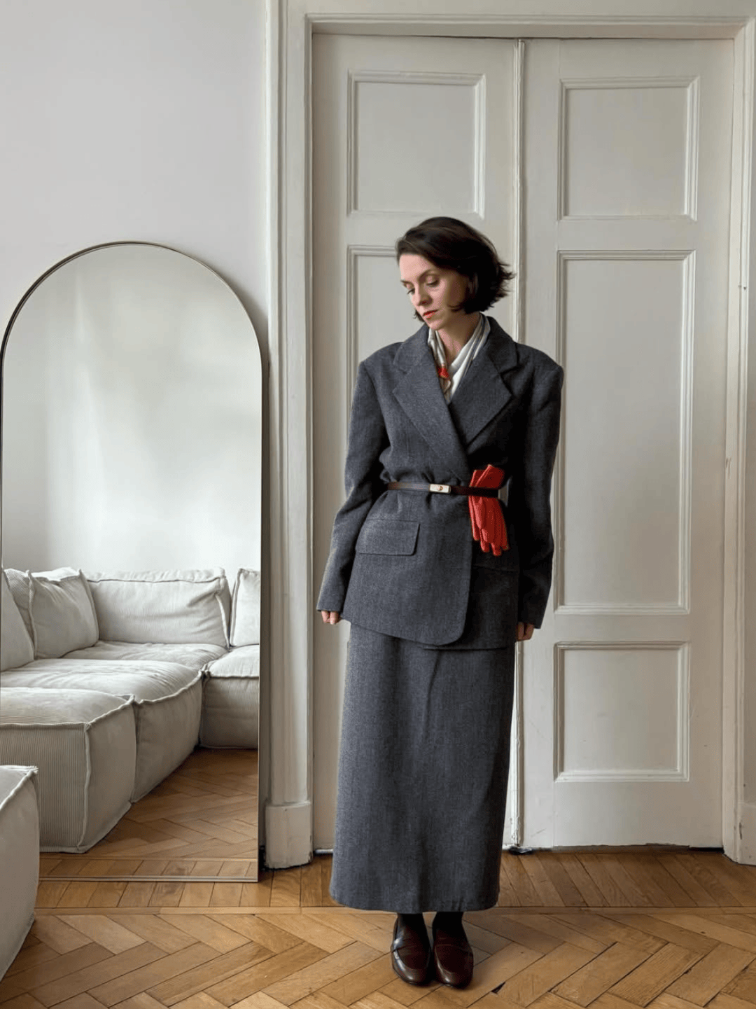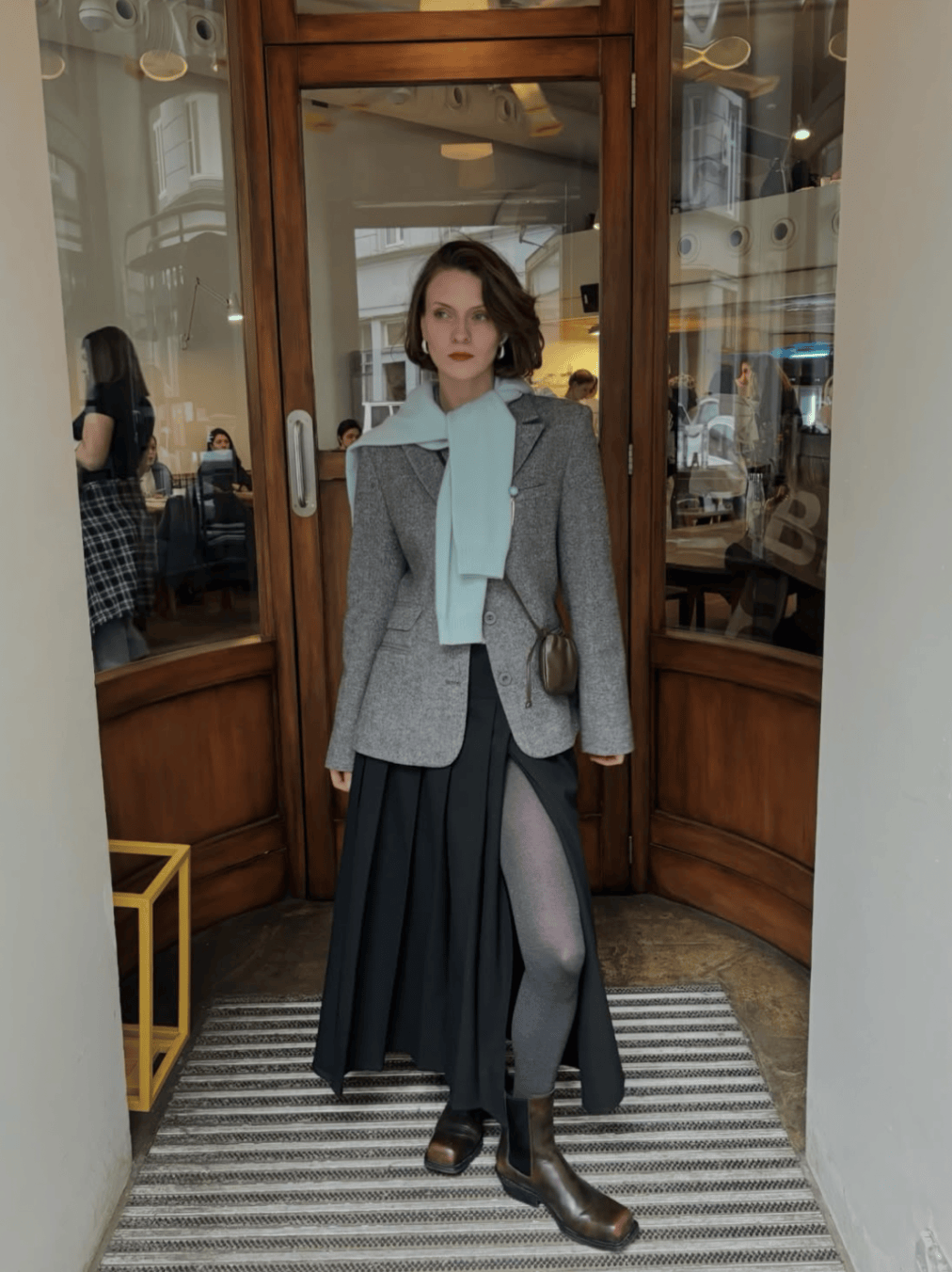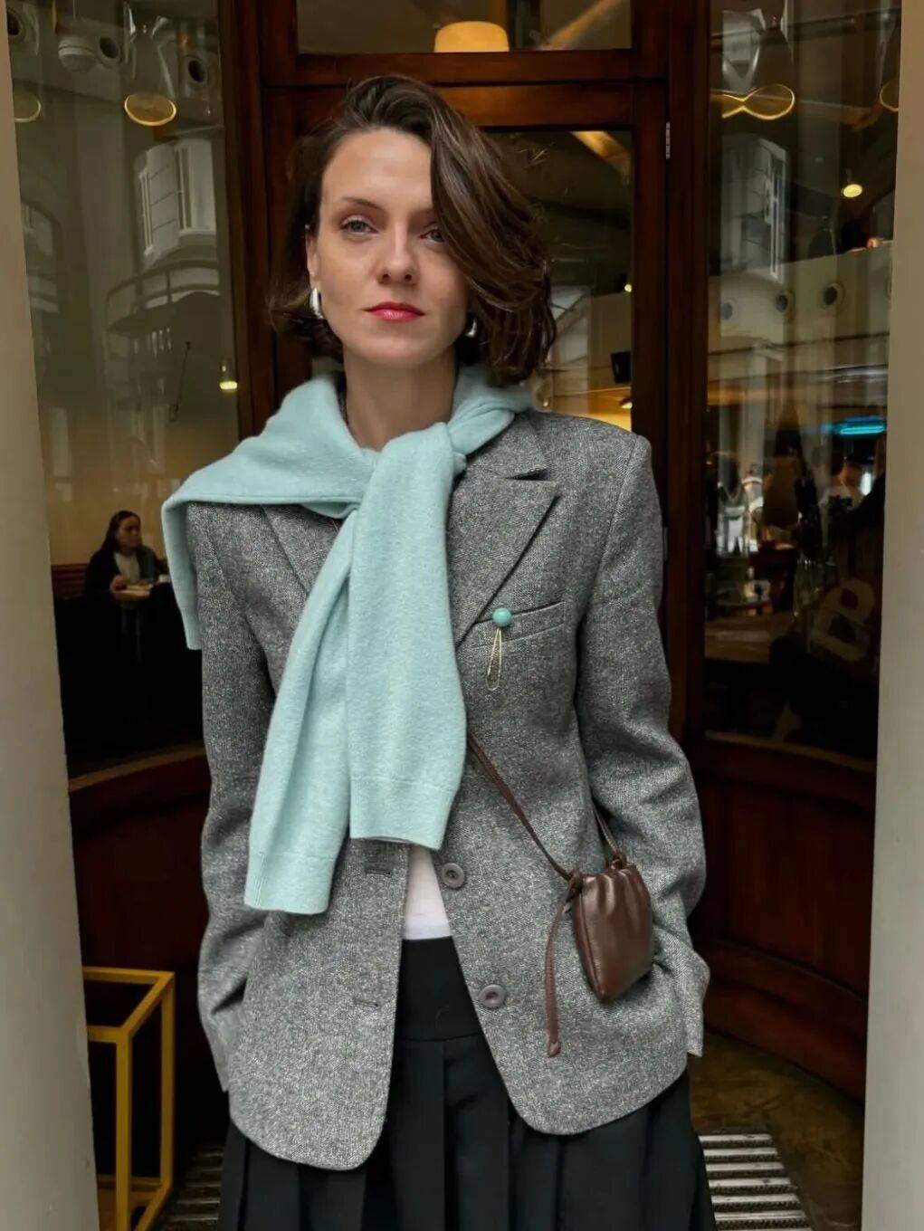 构成她冬日衣橱基调的是人人可以找到的单品:一件剪裁合身的西装外套、一条版型优秀的半裙、一件软糯的雾蓝色针织衫......