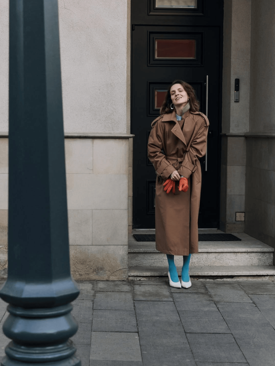 还有,如果大衣袖口的蓝色不够明显,就再用同色系的手套增加这抹蓝色的存在感。