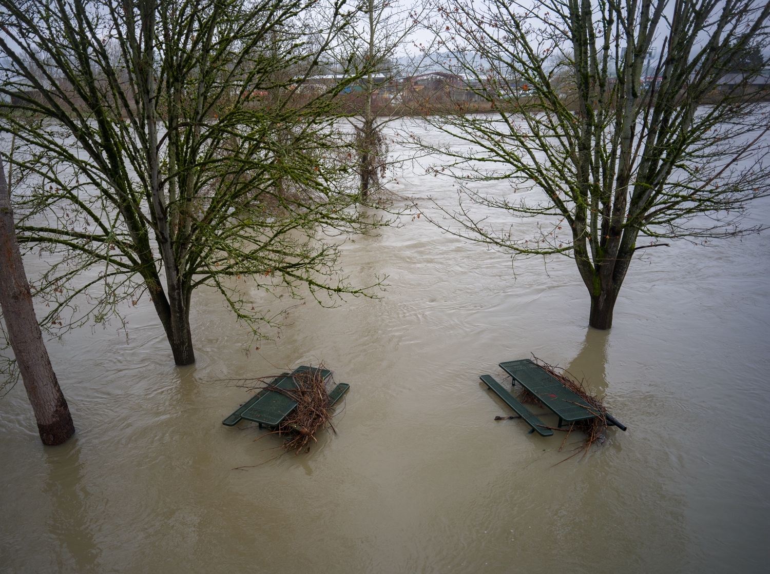 2025年12月12日,受持续强降雨影响,美国华盛顿州斯诺霍米什县境内的斯诺霍米什河(Snohomish River)泛滥成灾,摆放在居民休闲场所的野餐桌几乎被洪水淹没。(Natalie Behring/Getty Images)