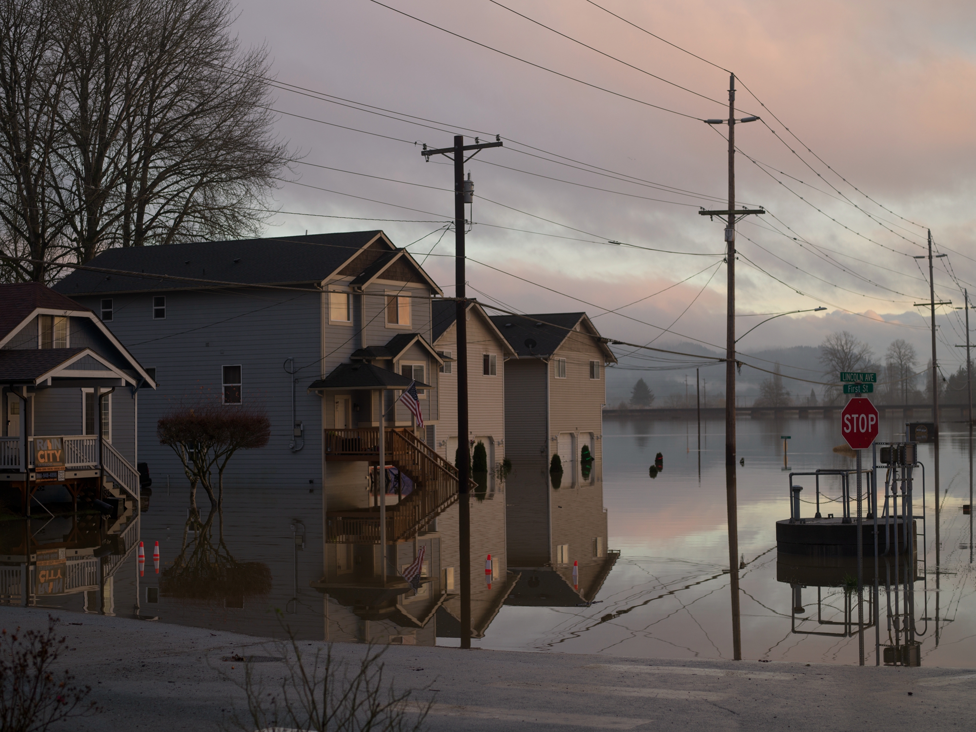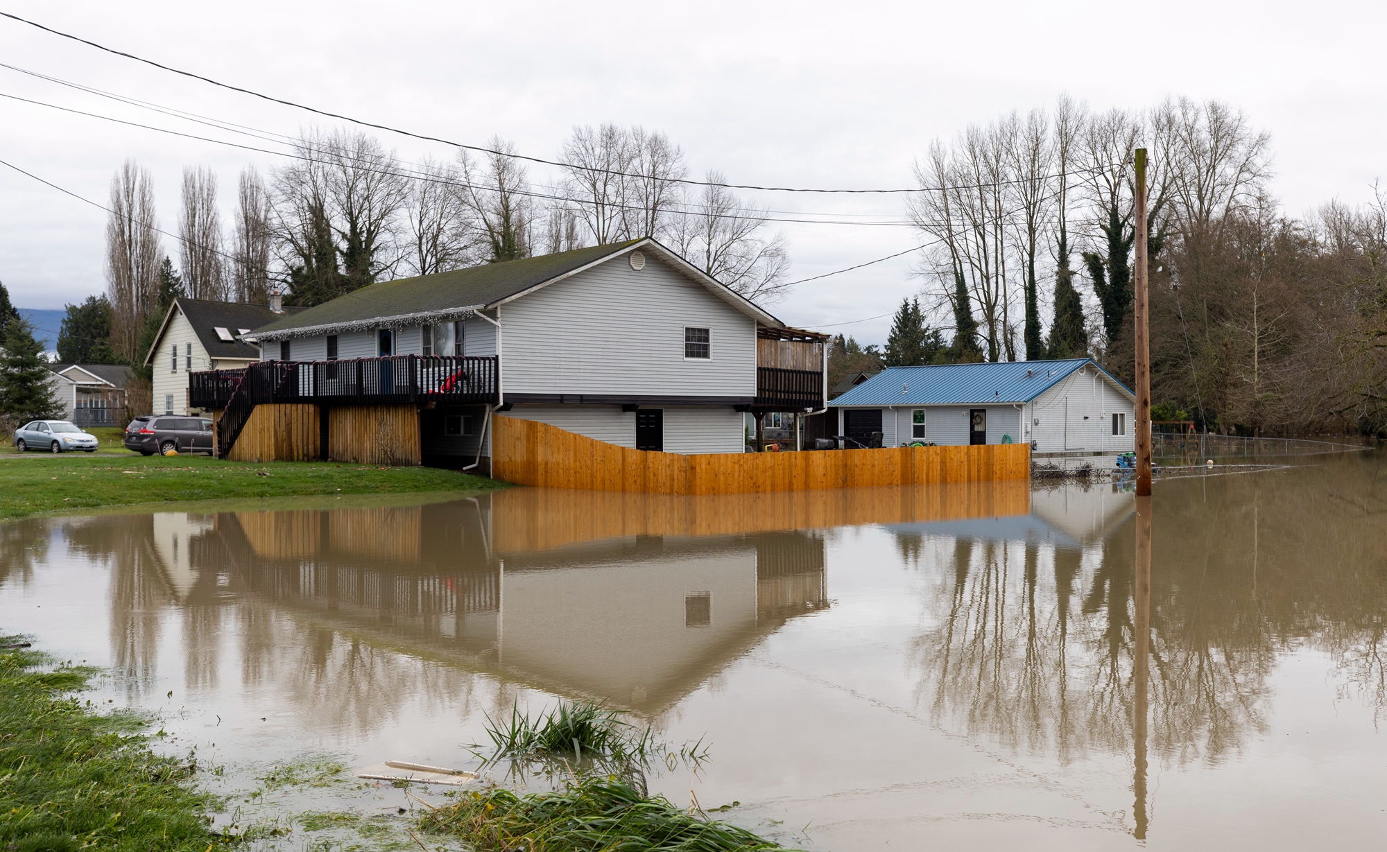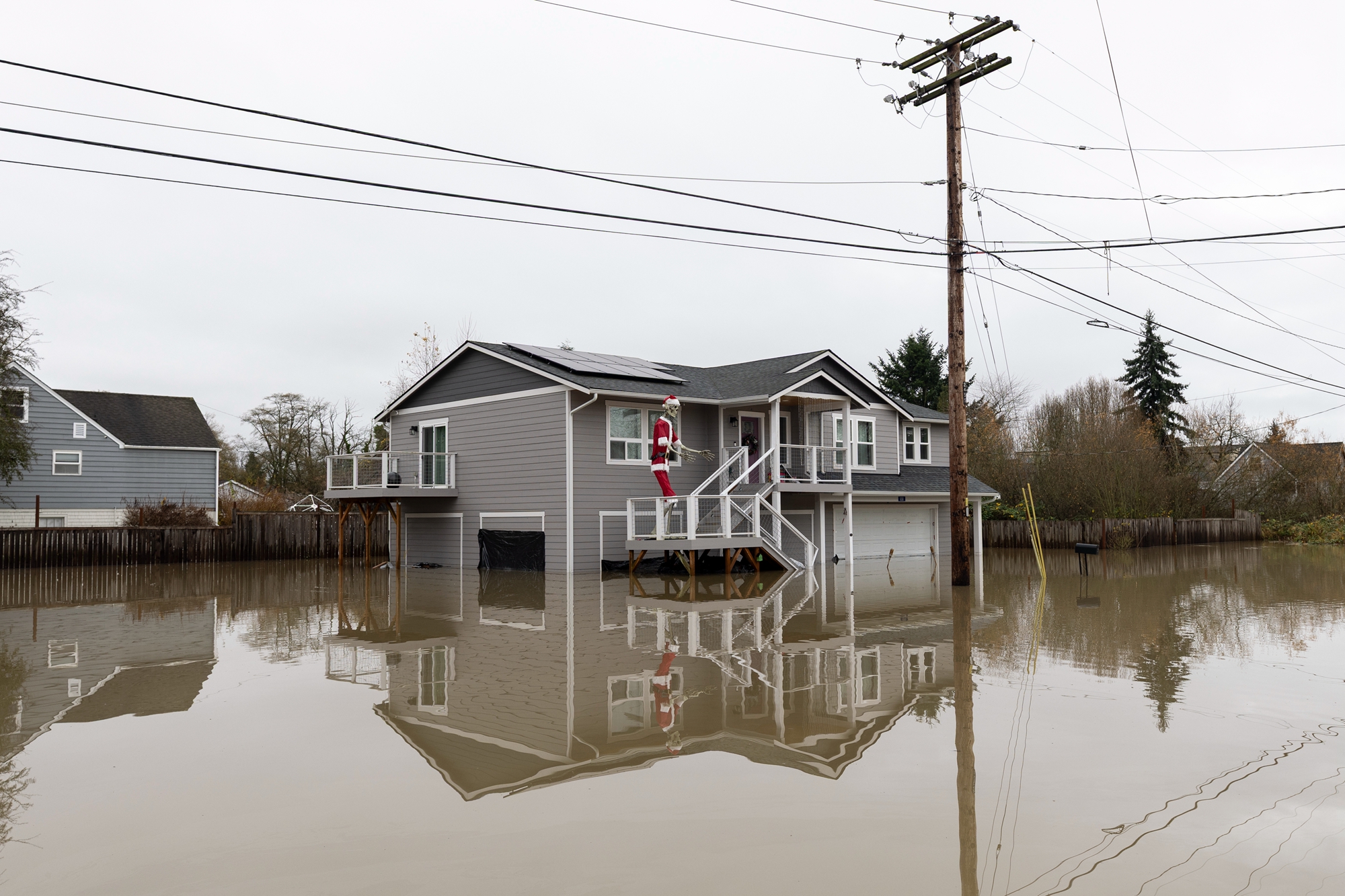 2025年12月12日,华盛顿州伯灵顿市(Burlington)遭遇严重洪灾,当地多所房屋被洪水围困。(Natalie Behring/Getty Images)