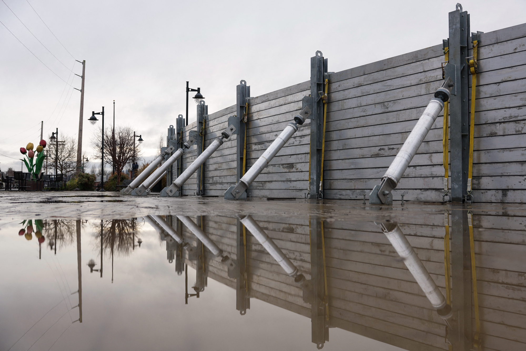 2025年12月12日,华盛顿州芒特弗农市(Mount Vernon)在斯卡吉特河沿岸修建了防洪墙,以应对洪水威胁。(Jason Redmond/AFP via Getty Images)