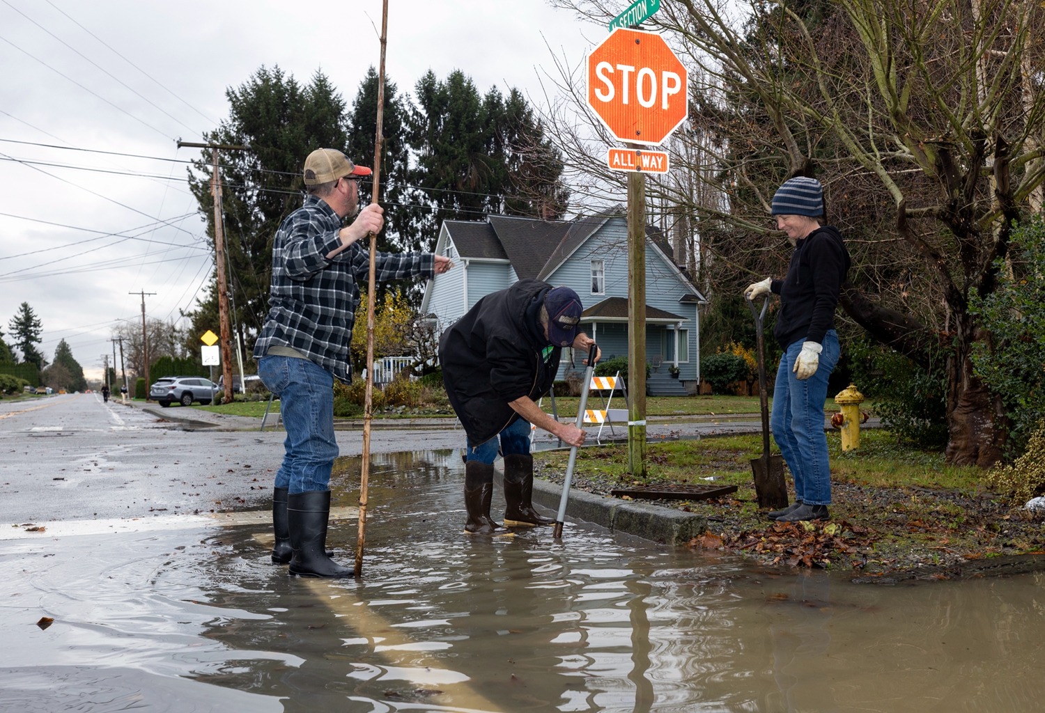 2025年12月12日,华盛顿州伯灵顿市(Burlington)遭遇严重洪灾,当地居民设法清理排水沟,以便让洪水尽快退去。(Natalie Behring/Getty Images)
