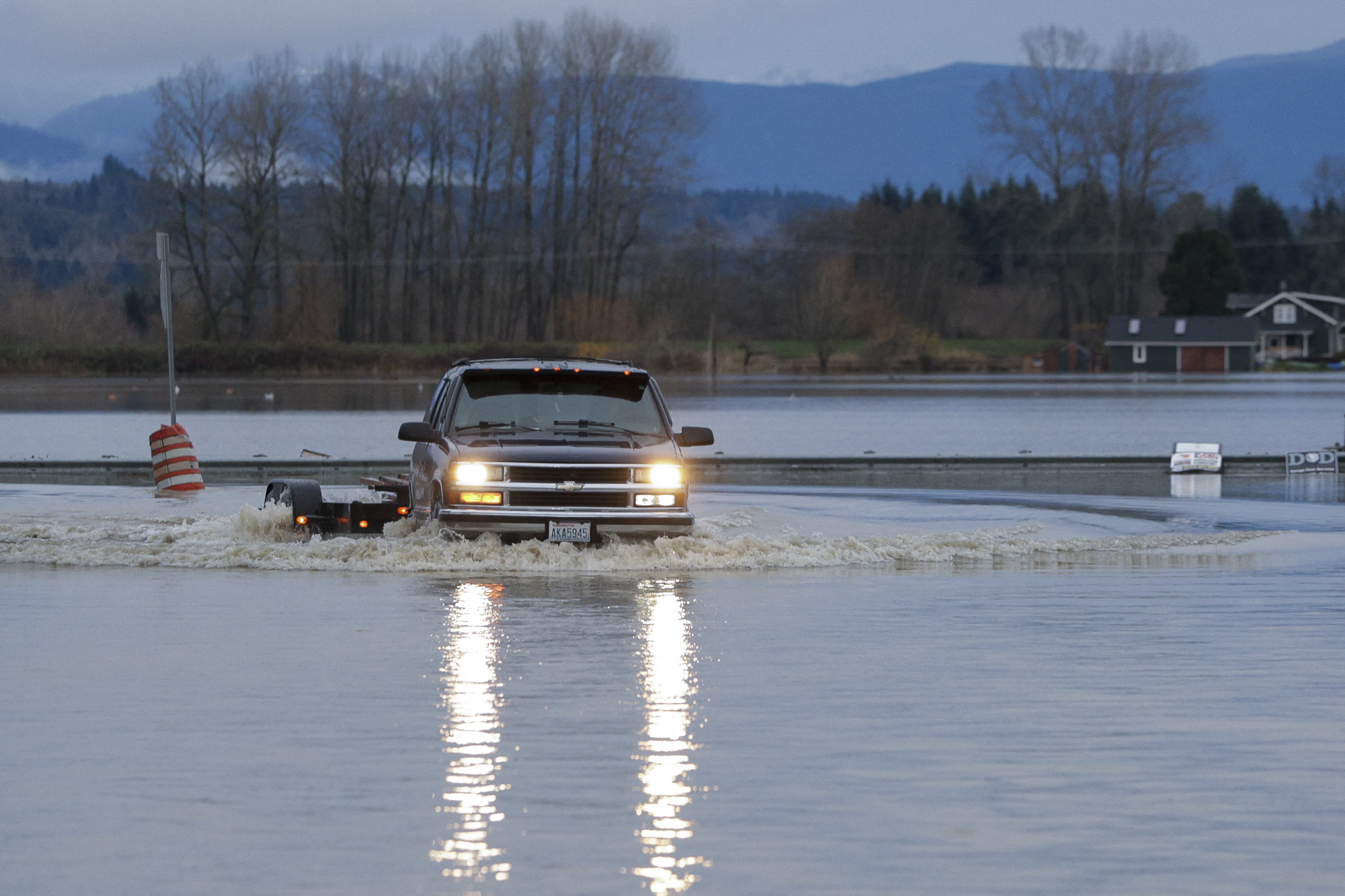 2025年12月11日,美国华盛顿州斯诺霍米什县境内的斯诺霍米什河(Snohomish River)泛滥,一名司机冒险涉水而行。(Jason Redmond/AFP via Getty Images)